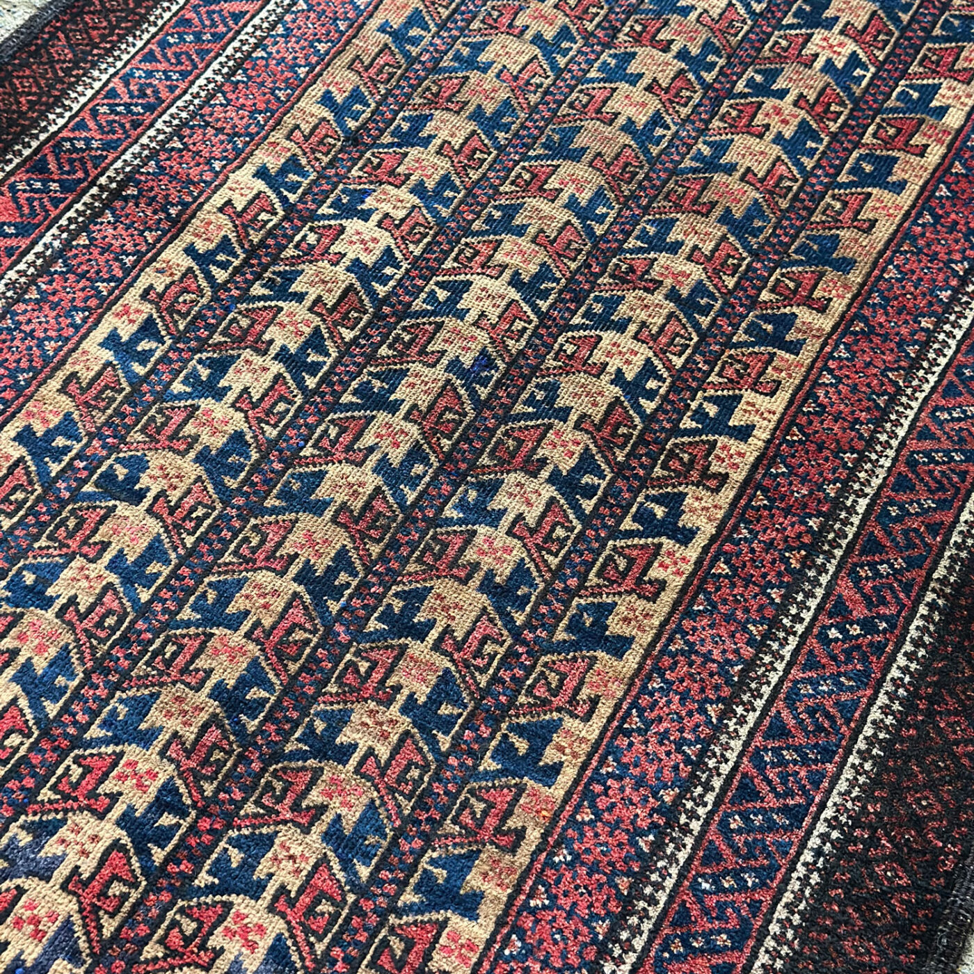 バルーチ族はイラン系部族であり、イラン南東部とパキスタン南西部にまたがるバルチスターン地方、アフガニスタン南西部ニームルーズと広範囲に分布し、生活しています。 バルーチ族の織る絨毯は、深い赤(えんじ色)や紫、黒(濃紺)の少ない色数の配色が特徴。デザインは幾何学文様の繰り返し柄、メヘラブ文様、花や鳥、樹木文様など直線的表現によるものが多く見られます。シスタンに住む人々は家族や馬に乗る人物など具象的な文様を織ります。トライバル絨毯の研究家であるアリ・ハスリは、バルーチとシスタンの人々が織る絨毯はバルーチとして混同すべきではない。その特徴の違いからシスタン絨毯、バルーチ絨毯と分けて考えるべきである、と語っています。染織文化は奥深く、新たな発見が期待されます。