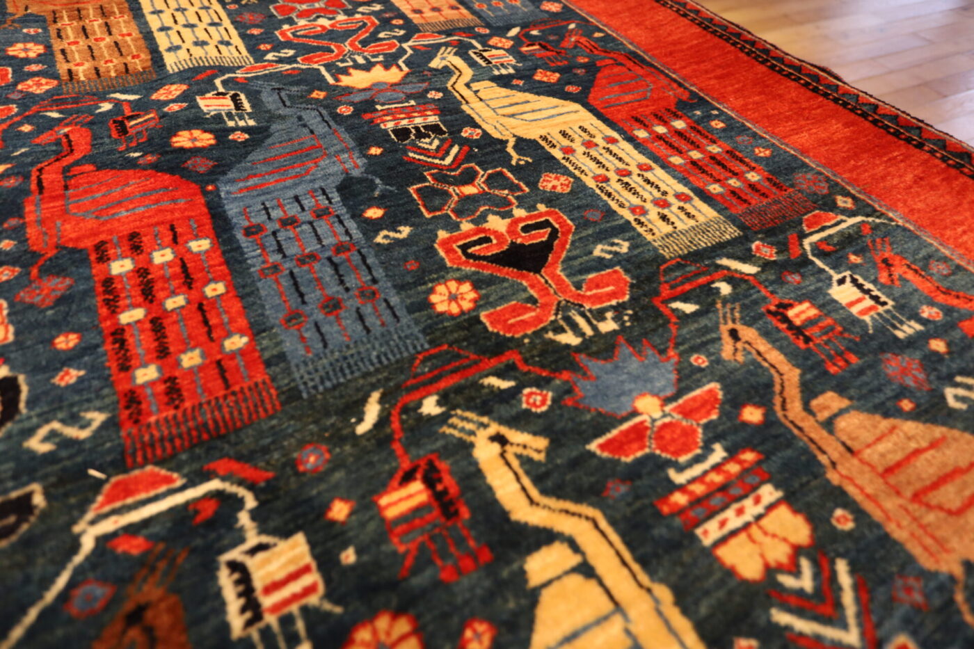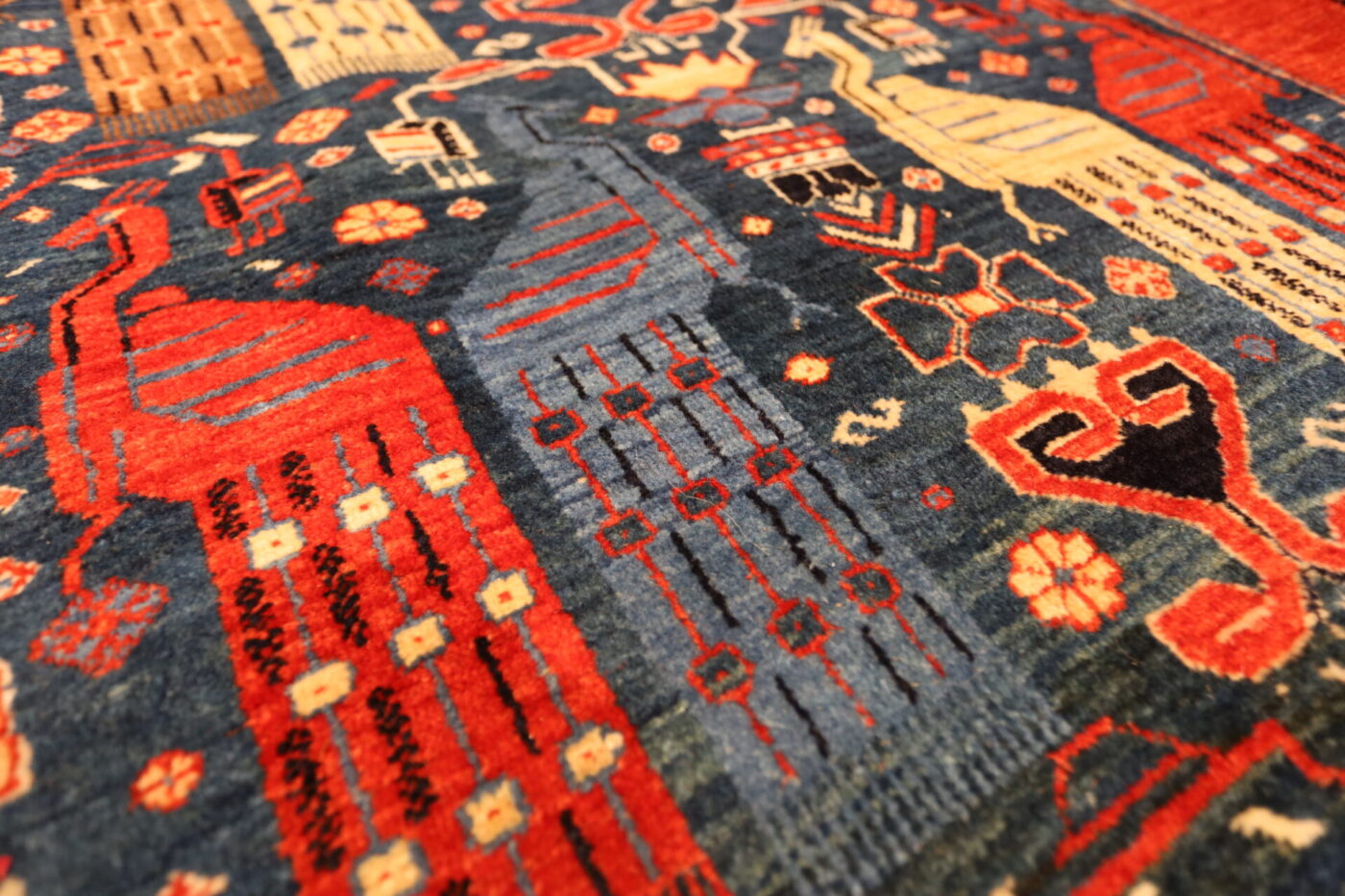 The Qashqai people are a nomadic group representing Iran in the southwestern Fars province, primarily composed of Turkic ethnicities with roots in Central Asia and Azerbaijan. Even in modern times, there are still people who do not settle, and continue to live a nomadic lifestyle. They move back and forth across the Zagros Mountains, spending winters in the pastures near the Persian Gulf and summers in tents at the cooler foothills of the Zagros. Spinning thread and weaving carpets are tasks typically performed by women, while men are responsible for herding sheep and shearing wool. The carpets they produce feature intricate abstractions of divine creatures and plants that have been passed down since ancient times, as well as bold, large representations of lions and other motifs in a coarse weave known as Gabbeh. Additionally, they are famous for other woven textiles such as kilims, jajims, and sumaks, which are not pile-woven. These textiles have been used as traditional items such as horse-cover, saddle bags, bags, salt bags, and bedding.